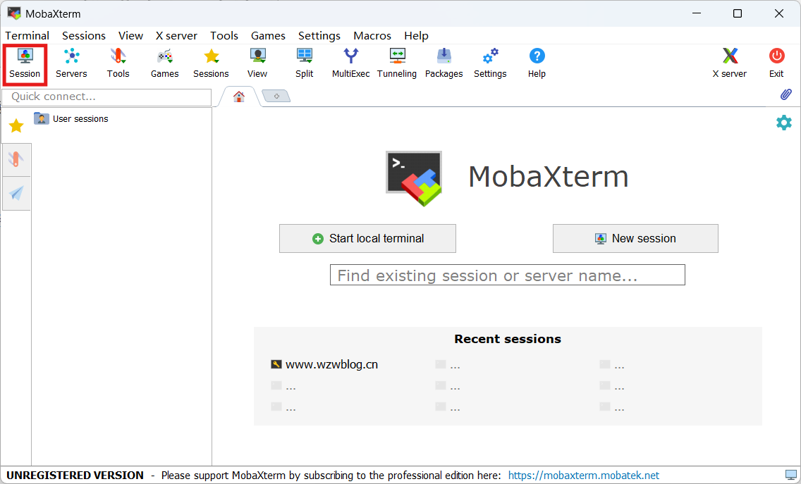打开MobaXterm,点击功能栏里的“Session”