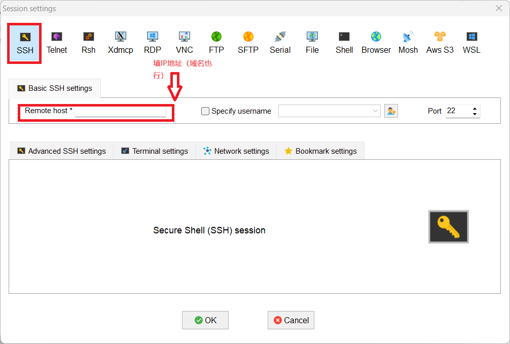 在弹出的框框中选择SSH,并填好服务器的IP地址,然后点OK